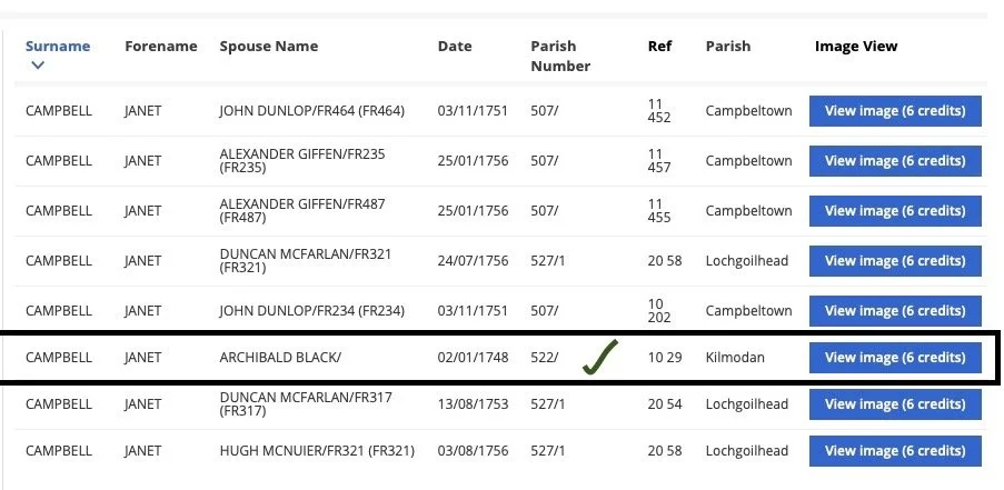 After carefully analysing each record, I settled on the 1748 marriage record for “Archibald Black” and “Janet Campbell”. Why?