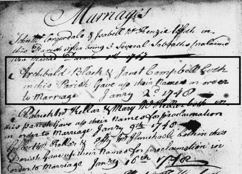 Janet and Archibald's wedding certificate. "Archibald Black and Janet Campbell both in this parish gave up their names in order to marriage 2nd Janry 1748"