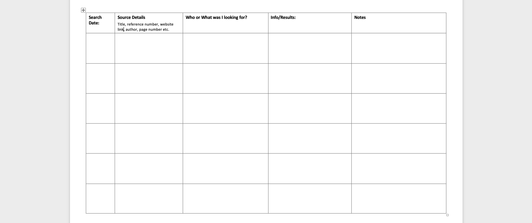 I prefer to keep my research logs online in a word processor. That way, I can easily type any details and copy and paste links or notes. The sections of the chart also automatically expand while I type, meaning I can fit as much or as little info in as I need. But do what works for you. If you want paper research logs, make up a template on a word processor or draw one, then keep that prototype blank for printing or photocopying whenever you need more.