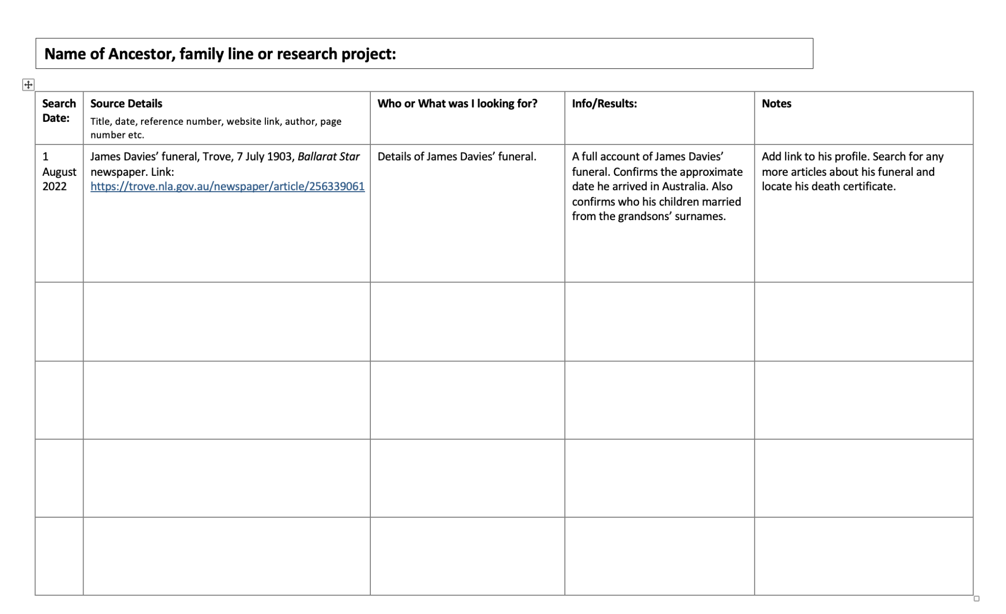 Have a good think about what you want to use the chart for, then customise the size and headings to suit your circumstances. You may wish to create different templates for different types of research - e.g a special template for researching newspapers, birth, marriage and death certificates and so on. To extend your research chart, simply photocopy or print your paper version, or copy and paste your blank prototype research log to a new page.