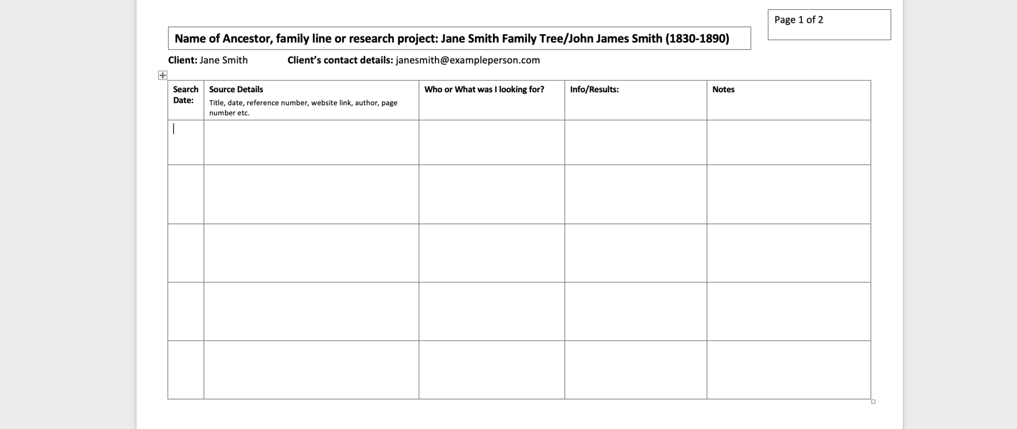 On a professional note, keeping a research log is a huge mark of respect to your client. It shows that you are taking the time to make notes of what you are researching and means you don't lose vital information that they are paying you to research for. Also, you can send your research logs to your client to give them a friendly update of what you have found so far and where you intend to search next. Here is an example of a professional research log: