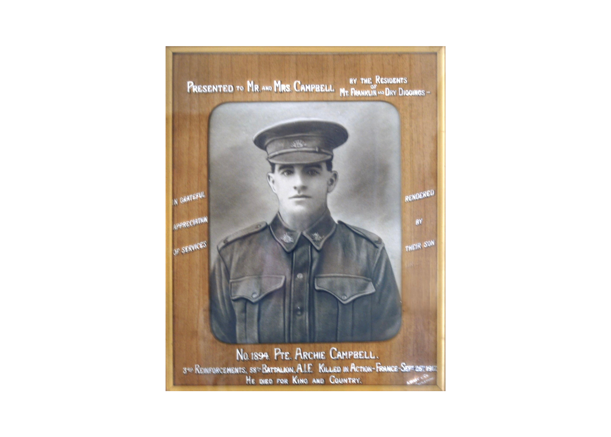 [1] Service record of Archibald Campbell, 58th Battalion, First Australian Imperial Force, Personal Dossiers, 1914-1920, National Archives of Australia, B2455, CAMPBELL A, p.9; ‘In Memoriam. On Active Service.’ Argus, 27 September 1918, p.1, http://nla.gov.au/nla.news-article1403447; ‘In Memoriam. On Active Service.’, Age, 25 September 1919, p.1, http://nla.gov.au/nla.news-article202441725; ‘In Memoriam - Campbell.’, Daylesford Advocate, Yandoit, Glenlyon and Eganstown Chronicle, 19 October 1917, p.2, http://nla.gov.au/nla.news-article119558989; ‘In Memoriam. On Active Service.’ Age, 26 September 1918, p.1 http://nla.gov.au/nla.news-article155139523; ‘Died On Service. Campbell.’, Argus, 20 October 1917, p.13, http://nla.gov.au/nla.news-article1657548; ‘In Memoriam. On Active Service.’, Age, 26 September 1919, p.1, http://nla.gov.au/nla.news-article202439385; ‘District Soldier’s Death.’, Daylesford Advocate, Yandoit, Glenlyon and Eganstown Chronicle, 19 October 1917, p.3, http://nla.gov.au/nla.news-article119558976; ‘In Memoriam. On Active Service.’, Argus, 26 September 1919, p.1, http://nla.gov.au/nla.news-article4682789; ‘In Memoriam. On Active Service.’, Argus, 26 September 1921, p.1, http://nla.gov.au/nla.news-article4648893.
